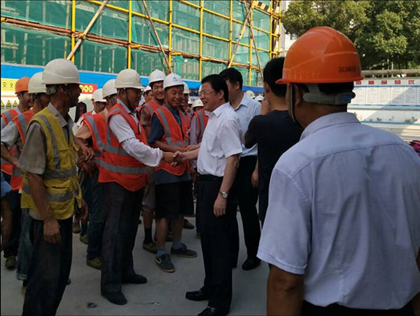 在施工现场,顾县长看望了在高温酷暑下作业的一线施工人员,亲切和工人们握手,送上防暑降温用品,对职工们的辛勤劳动表示由衷地感谢,并再三叮嘱工人们在高温天气要注意身体,合理安排作息时间,切实做好防暑降温和安全生产工作。