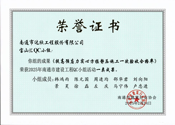 2月24日,南通市建筑行业协会发布2025年南通市工程建设质量管理小组(QC 小组)活动评价结果,公司宝山区大场镇 W12-1301 单元 32-04 地块项目宝山汇 QC 小组选送的《提高预应力实心方桩静压施工一次验收合格率》成果,荣获一类成果。